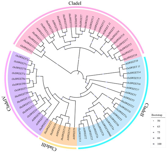 Phylogenetic tree of SWEET sequences from Hylocereus undatus, Arabidopsis thaliana, and Oryza sativa. Note: subfamilies I, II, III, and IV are represented in pink, light blue, light orange, and purple, respectively. The phylogenetic tree was constructed using the maximum likelihood method, and 1000 repeats were used. Black means that in 1000 repeats, bootstrap values > 90; gray means that in 1000 repeats, 90 > bootstrap values > 70; and white gray means values < 70.