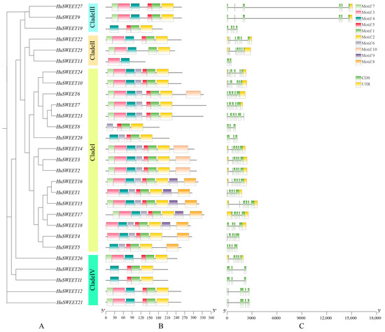 Analysis of conserved motifs and gene structure of HuSWEET genes. Note: (A) Members of the HuSWEET gene family. (B) Motif composition of HuSWEET protein. Ten patterns are displayed in rectangles of different colors. (C) The green, yellow, and black exon–intron groups of the HuSWEET gene correspond to the non-coding region, exon, and intron, respectively.