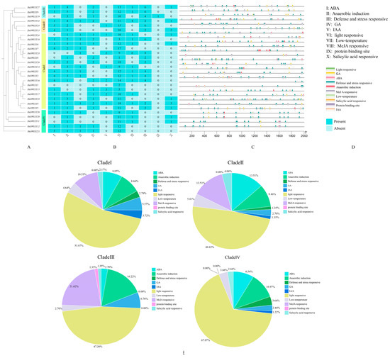 Distribution of cis-acting elements in the 2000 bp sequence upstream of the HuSWEET gene. Note: different cis-acting elements are represented by different colors. (A) members of the HuSWEET gene family; (A) the number of cis-acting elements of each HuSWEET gene; (B) the numbers in the heatmap box indicate the number of different elements in these HuSWEET; (C) the position of each cis-acting element; (D) class of cis-acting element; (E) percentage of HuSWEET gene promoter cis-elements in different subfamilies, with different colors representing different promoter cis-element classifications.