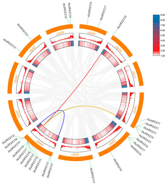 Collinearity analysis of HuSWEET gene in H. undatus. Note: gray lines represent all duplicate genes, red and orange lines represent fragments of HuSWEET gene pairs, and blue lines represent tandem duplicate gene pairs. The heat map and line map are gene densities and the line map density increases from white to red to blue. The yellow rectangles are chromosomes, and the chromosome names are displayed between each chromosome and the gene density.