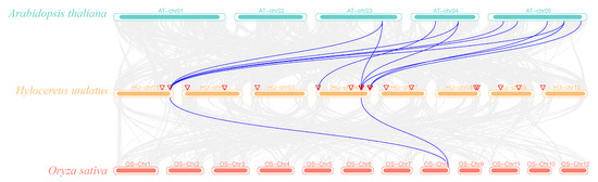 The collinear distribution of H. undatus, A. thaliana, and O. sativa. Note: the blue line connects the HuSWEET gene with the collinear relationship of A. thaliana and O. sativa. The gray lines connect the collinearity of other genes. Hu-, At-, and Os- represent the chromosomes of H. undatus, A. thaliana, and O. sativa, respectively, followed by chromosome serial numbers.