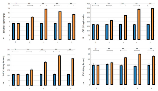 For the low-temperature stress treatment group and the room temperature culture group, samples were collected at 0, 12, 24, 48, and 72 h, and three biological replicates were set up for each treatment. Reagent solutions such as phosphate-buffered saline (PBS), methionine (Met), EDTA-Na2, riboflavin, hydrogen peroxide (H2O2), and nitroblue tetrazolium (NBT) were prepared. The leaves of the tissue-cultured plantlets were collected, ground in phosphate buffer in an ice bath, centrifuged, and the supernatant was obtained. The catalase (CAT) test kit (Baiolaibo Technology Co., Ltd., Beijing, China) was used to measure CAT enzyme activity, and the determination method followed the kit instructions. The enzyme mixture was added to the reaction mixture, and the change in absorbance at 240 nm was measured. CAT activity was calculated based on the change in absorbance [37]. The SOD enzyme activity was measured using a total superoxide dismutase (T-SOD) assay kit (Bohu Biotechnology Co., Ltd., Shanghai, China). Through chromogenic reactions, T-SOD activity was calculated by measuring the change in absorbance of each solution at 450 nm under specific conditions [37]. POD enzyme activity was measured using a peroxidase (POD) test kit (Renjie Biotechnology Co., Ltd., Shanghai, China). The enzyme mixture was added to the reaction mixture, and the change in absorbance at 470 nm was measured. The POD activity was calculated based on the change in absorbance [37].