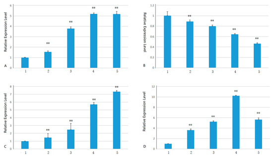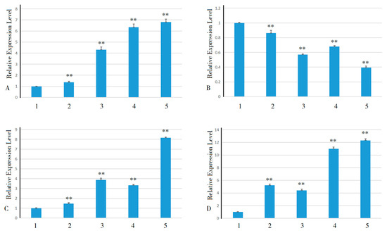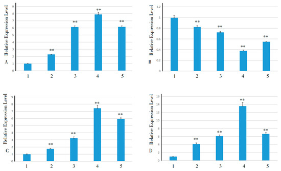 Changes in the expression of SWEET gene family members associated with low-temperature stress response in pitaya after application of MeJA subjected to low-temperature stress. Note: (A) HuSWEET5; (B) HuSWEET12; (C) HuSWEET14; (D) HuSWEET21. 1, 2, 3, 4, and 5 represent treatments at 4 °C for 0 h, 6 h, 12 h, 48 h, and 72 h, respectively. **, highly significant differences (p < 0.01).