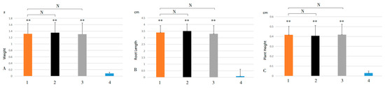 Growth condition of in vitro pitaya seedlings after being subjected to low-temperature stress. Note: (A) is the difference in weight; (B) is the difference in root length; (C) is the difference in plant height. Treatment 1, 30 d at room temperature; 2, 30 d at room temperature after the addition of ABA to the medium and low-temperature stress for 72 h; 3, 30 d at room temperature after the addition of MeJA to the medium and low-temperature stress for 72 h; 4, 30 d at room temperature after low-temperature stress for 72 h. **, compared with treatment 4, the difference was highly significant (p < 0.01); N, compared with treatment 4, the difference was not significant (p > 0.05).