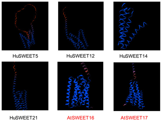 The expression profiling analysis revealed that the expression levels of four genes, HuSWEET5, HuSWEET12, HuSWEET14, and HuSWEET21, significantly differed before and after low-temperature stress treatment. Therefore, these four genes are speculated to be members of the SWEET gene family associated with the low-temperature stress response in pitaya. We further predicted protein structures and found that the structural characteristics of HuSWEET5, HuSWEET12, HuSWEET14, and HuSWEET21 were similar to those of A. thaliana SWEET16 [38] (Figure 11), mainly beta-helix, which has been proven to play an important role in sugar transport. They have similar functions.