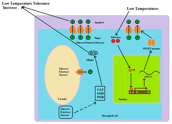Through the transport regulation and distribution of soluble sugars, SWEET gene family members indirectly affect the activity of antioxidant enzymes and the antioxidant capacity of plants (Figure 10). Under low-temperature stress, changes in the activities of CAT, SOD, and POD are vital physiological responses of plants to address low-temperature stress, and their activities usually tend to increase [12,51,52]. These studies indicated that the increase in the activities of CAT, SOD, and POD was a general adaptive response of plants to low-temperature stress. In this study, the activities of the enzymes CAT, T-SOD, and POD significantly changed after the plants were exposed to low-temperature stress. Low-temperature stress causes plants to produce large amounts of reactive oxygen species (ROS), which cause oxidative damage to cells. In addition, antioxidant enzymes (such as SOD and POD) can remove these reactive oxygen species and protect cells from oxidative damage [51]. Although SWEET genes are not directly involved in the synthesis regulation or activity of antioxidant enzymes, they can indirectly affect the activity of antioxidant enzymes and the antioxidant capacity of plants.