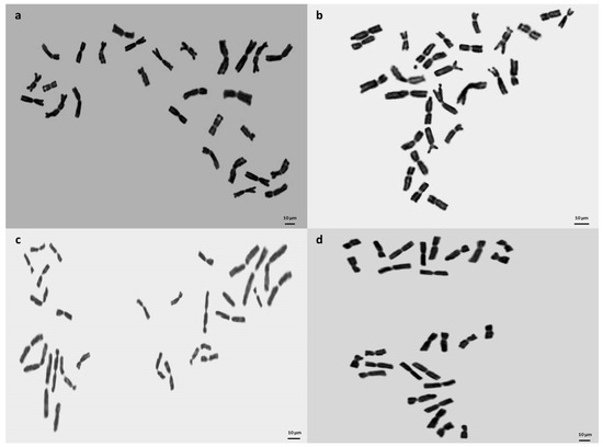 Micrographies of tetraploid metaphase plates (2n = 4x = 28) of Ae. crassa cytotype 1. (a) Batman; (b) Bitlis; (c) Diyarbakir; (d) Hakkari. Scale bar = 10 μm.