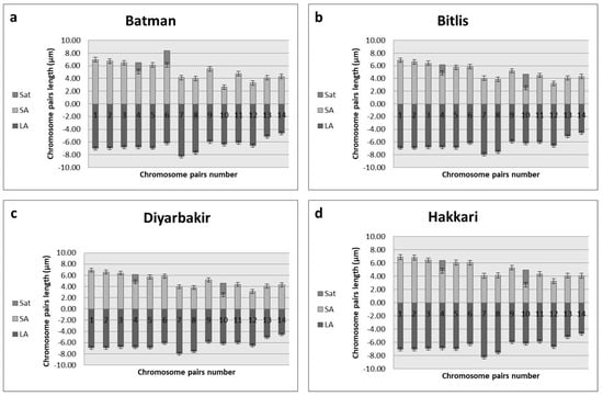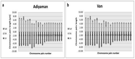 Cytotype 1 was identified in populations sampled from the southeastern regions of Türkiye. This cytotype is characterized by relatively large chromosomes, ranging in length from 9.87 μm to 13.96 μm, with a total mean chromosome length of 165.51 μm. The karyotype consists of nine pairs of metacentric chromosomes, three pairs of submetacentric chromosomes, one pair of metacentric chromosomes with satellites, and one pair of submetacentric chromosomes with satellites.