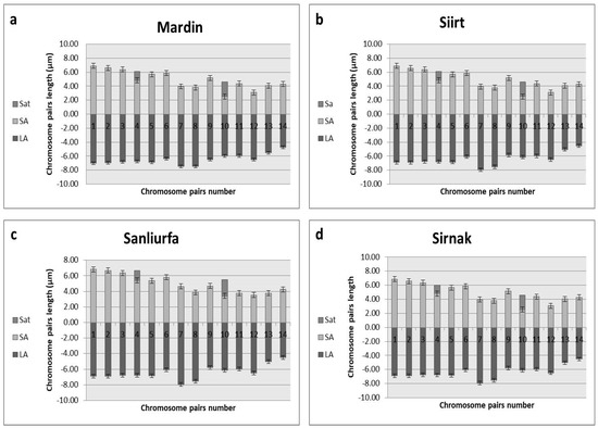 Haploid ideogram of tetraploid cytotypes of Ae. crassa (2n = 4x = 28); (a) Mardin; (b) Siirt; (c) Şanliurfa; (d) Şirnak.
