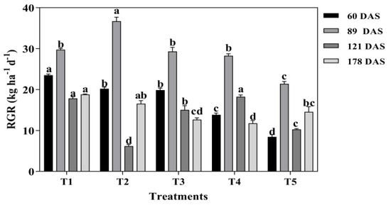 Relative growth rate was significantly affected by mixed cropping treatment (p < 0.05, Figure 2). At 60 DAS, the RGR was significantly decreased with decreased oats and increased alfalfa sowing rate. The highest RGR was generated under T1 (except T2 at 89 DAS), which showed 14.13%, 15.50%, 41.19%, and 64.09% higher than T2, T3, T4, and T5, respectively. At 89 DAS, the RGR significantly increased initially and then decreased with increased alfalfa and decreased oats mixture sowing rate. The maximum RGR was observed under T2 mixed cropping treatment, which showed 18.95%, 20.13%, 23.02%, and 71.41% higher RGR than T1, T3, T4, and T5 treatment, respectively (Figure 2). However, the highest RGR showed under T1 and T4 treatments at 121 DAS, but the lowest RGR was under T2 treatment. At 178 DAS, the RGR was significantly decreased with decreased oats and increased alfalfa sowing rate except under T5 treatment. T1 produced the maximum RGR, which was 11.97%, 32.74%, 37.43%, and 22.65% higher than T2, T3, T4, and T5, respectively (Figure 2).