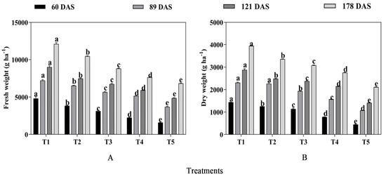 The forage yield of fresh weight and dry weight of oats and alfalfa were significantly affected by mixed cropping treatment (p < 0.05, Figure 3). With decreased oats and increased alfalfa sowing rate, the fresh weight and dry weight significantly declined at different growth periods (p < 0.05). It is worth noting that the highest forage yield of both fresh weight and dry weight was shown under T1 treatment at each growth stage. Compared with T1 treatment, the forage yield of fresh weight decreased by 20.16% at 60 DAS, 9.37% at 89 DAS, 17.01% at 121 DAS, and 13.54% at 178 DAS under T2 treatment; decreased by 34.82%, 21.44%, 25.22%, and 27.13% under T3 treatment; decreased by 53.23%, 28.46%, 34.33%, and 36.94% under T4 treatment; and decreased by 142.77%, 76.85%, 53.66%, and 53.03% under T5 treatment, respectively (Figure 3A). Additionally, the forage yield of dry weight in each growth period decreased by 13.06%, 1.92%, 13.59%, and 14.90% under T2 treatment compared with T1, respectively; decreased by 21.06%, 16.27%, 17.48%, and 21.90% under T3 treatment; decreased by 45.74%, 31.79%, 25.32%, and 30.18% under T4 treatment; and decreased by 182.41%, 110.94%, 76.12%, and 58.93% under T5 treatment, respectively (Figure 3B).
