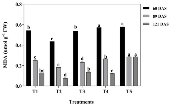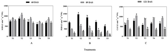 It can be seen from Figure 8 that the activities of SOD, POD, and CAT were significantly affected by mixed cropping treatment (p < 0.05). On the whole, the activities of antioxidant enzymes were all increased from T1 to T2 and decreased from T2 to T5 with decreased oats and increased alfalfa sowing rate at each growth period. The highest activities were concordant and showed under T2 treatment (Figure 8). At 60 DAS, T2 generated 19.23% and 29.22% higher SOD activities, 58.56% and 116.98% higher POD activities, and 33.51% and 20.89% higher CAT activities than T1 and T5 treatments, respectively. At 89 DAS, the activities of SOD, POD, and CAT under T2 treatment were 22.32%, 48.95%, and 27.87% higher than that under T1, and 26.19%, 171.96%, and 13.82% higher than that under T5 treatments, respectively. Similarly, T2 treatment increased by 7.72% and 22.29% for SOD, by 53.26% and 199.75% for POD, and by 26.78% and 19.19% for CAT compared with T1 and T5 at 121 DAS, respectively (Figure 8).