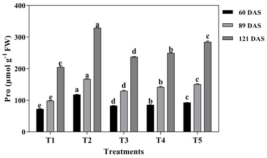 However, the variation tendency was the opposite between MDA and Pro under each treatment and at all growth periods. The content of MDA showed a decrease first and then increased with decreased oats and increased alfalfa sowing rate at each growth period. Both the lowest contents of MDA and the highest contents of Pro were generated under T2 treatment at each growth period. Compared with T1 and T5, the contents of MDA decreased by 18.52% and 31.82% under T2 treatment at 60 DAS, by 38.89% and 61.11% at 89 DAS, by 62.50% and 262.5% at 121 DAS, respectively (Figure 6). Nevertheless, the content of Pro showed an increased tendency with decreased oats and increased alfalfa sowing rate. Contrary to MDA, T2 treatment showed 62.26% and 27.08% higher content of Pro than that of T1 and T5 at 60 DAS, 69.68% and 10.94% at 89 DAS, and 60.74% and 15.67% at 121 DAS, respectively (Figure 7).