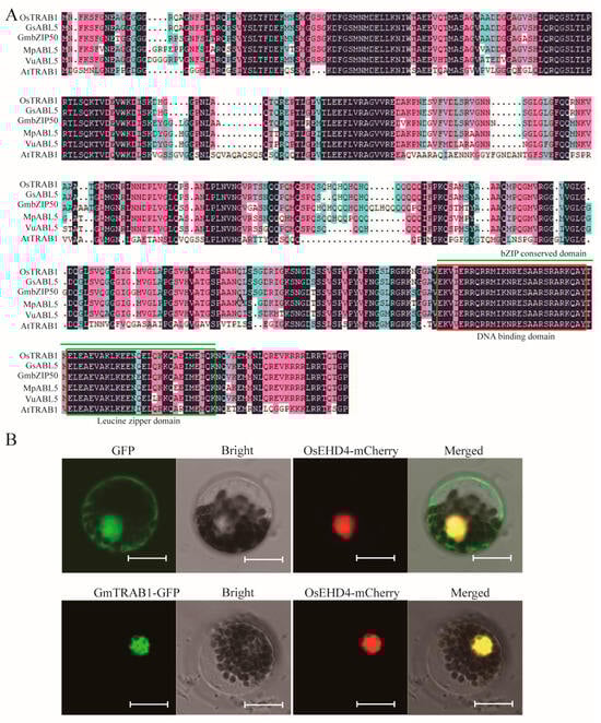 Results of bioinformatics analysis have shown that 160 bZIP transcription factors were identified in soybean [27]. GmTRAB1 (Glyma.04G039300) encoded a protein with a conserved bZIP domain and highly shared the sequence with GsABL5 from Glycine soja (99.52%), GmbZIP50 (89.35%), MpABL5 from Mucuna pruriens (87.97%), and VuABL5 from Vigna unguiculata (86.35%) (https://blast.ncbi.nlm.nih.gov/Blast.cgi?CMD=Get&RID=JEV01RW2016, accessed on 31 October 2024; Figure 1A). Subsequent phylogenetic analysis demonstrated that GmTRAB1 and its homologous proteins were classified into subgroup A (Figure S1). In the subcellular localization analyses, GmTRAB1-GFP proteins were detected in the nucleus and overlapped with the nuclear marker (OsEHD4-mCherry) [28] (Figure 1B).