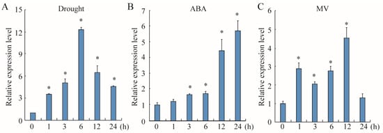 GmTRAB1 was involved in multiple stresses. The expression patterns of GmTRAB1 under (A) drought, (B) ABA, and (C) MV stresses were detected by qRT-PCR. GmTubulin was applied as an internal control. The * suggests significant differences (* p < 0.05).