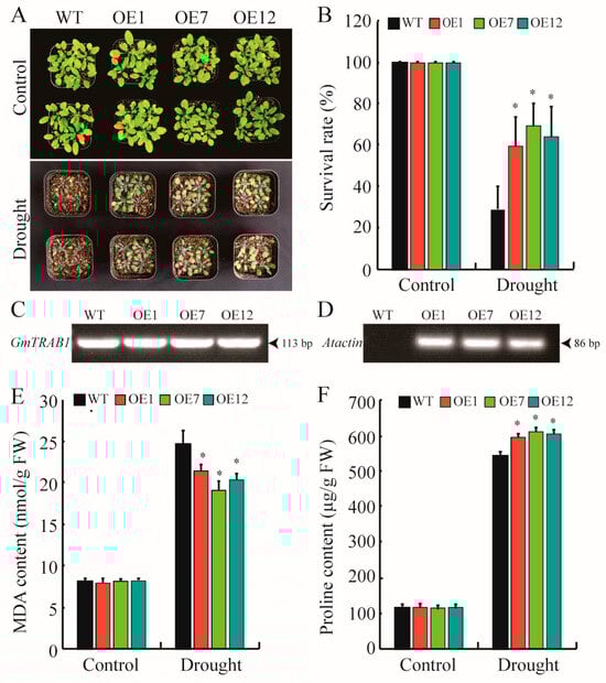 Overexpression of GmTRAB1 leads to enhanced osmotic stress tolerance in Arabidopsis. (A) Osmotic stress tolerance assay in GmTRAB1-OE and WT plants. (B) Survival rates. (C,D) GmTRAB1 transcripts were detected by semi-RT-qPCR. Atactin was applied as an internal control. (E) MDA content and (F) proline content in GmTRAB1-OE and control plants in response to drought. The data represent the value (±SE) of 3 independent replicates. The * suggests significant differences (* p < 0.05).