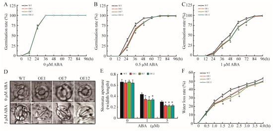 GmTRAB1 overexpression improved ABA sensitivity in transgenic plants. (A–C) The germination rates of GmTRAB1-OE and WT seeds under 0, 0.5, and 1 μM ABA treatments were analyzed at 0, 12, 24, 36, 48, 60, 72, 84, and 96 h. (D) Phenotypes of GmTRAB1-OE and WT stomata upon ABA stress, Scale bars = 5 μm. (E) Stomatal closure of GmTRAB1-OE and WT upon ABA stress. The stomatal width/length ratio was utilized as the stomatal closure index. (F) Water loss rate. The detached leaves of GmTRAB1-OE and WT plants were calculated at 0, 30, 60, 90, 120, 150, 180, 210, and 240 min. The data represent the value (±SE) of 3 independent replicates. The * suggests significant differences (* p < 0.05).