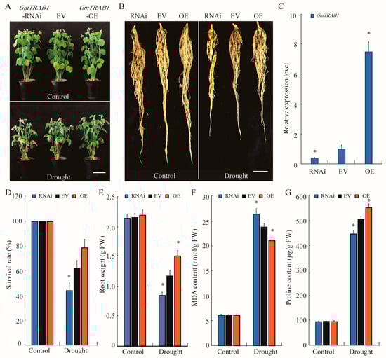 To verify the role of GmTRAB1 in soybean resistance to drought, we generated transgenic hairy roots of soybean with GmTRAB1-RNA interference (RNAi) silencing or overexpressing by Agrobacterium rhizogenes-mediated transformation. The GmTRAB1 expression was detected through qRT-PCR (Figure 5C). There were no significant differences in the growth and physiological characteristics of GmTRAB1 transgenic (RNAi and OE) and empty vector (EV) control soybean seedlings under suitable conditions. However, drought treatment caused remarkable morphological and physiological differences among different genotypes. Upon drought stress, the GmTRAB1-OE seedlings presented a higher survival rate and a lighter leaf-wilting phenotype than the EV seedlings. In contrast, the GmTRAB1-RNAi plants displayed a lower survival rate and a heavier leaf-wilting phenotype (Figure 5A,D). The fresh weights of GmTRAB1-OE hairy roots were larger than the control roots under drought treatment, but the GmTRAB1-RNAi hairy roots displayed lower biomass accumulations (Figure 5B,E). Moreover, the MDA levels in GmTRAB1-OE hairy roots were smaller than in the control roots under drought stress, whereas the GmTRAB1-RNAi hairy roots presented higher MDA accumulations (Figure 5F). In addition, the GmTRAB1-OE hairy roots presented a higher accumulation of proline than the control roots. However, under drought stress, the GmTRAB1-RNAi soybean roots had lower levels of proline (Figure 5G).