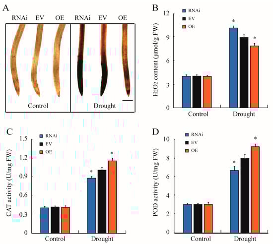 GmTRAB1 increased ROS scavenging under drought stress. (A) DAB staining, scale bars = 0.1 cm; (B) H2O2 content; (C) CAT activity; and (D) POD activity of GmTRAB1 transgenic (RNAi and OE) and EV roots under drought treatment. The data represent the value (±SE) of 3 independent replicates. The * suggests significant differences (* p < 0.05).