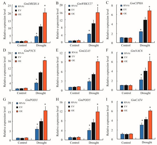 GmTRAB1 activates stress-responsive gene expression. Transcript level of (A) GmDRAB1A, (B) GmWRKY27, (C) GmCIPK6, (D) GmP5CS, (E) GmLEA5, (F) GmNAC6, (G) GmPOD3, (H) GmPOD5, and (I) GmCAT4 in GmTRAB1-RNAi, EV, and GmTRAB1-OE hairy roots under drought stress. The data represent the value (±SE) of 3 independent replicates. The * suggests significant differences (* p < 0.05).