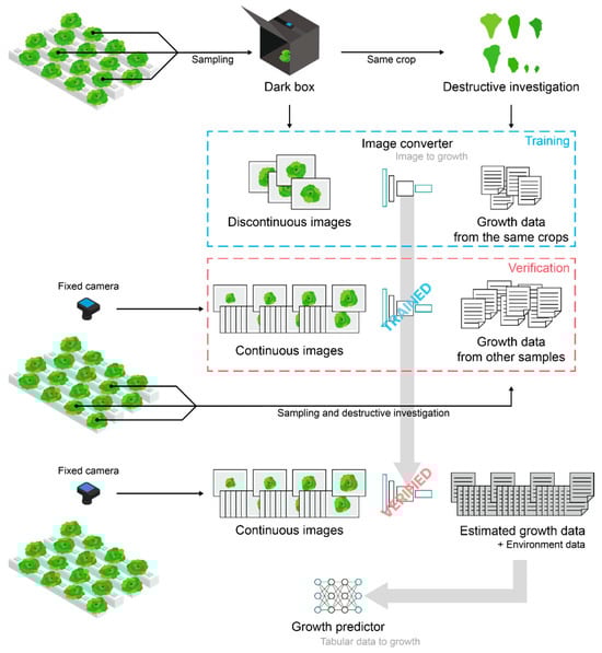 The ultimate objective was model construction to predict crop growth for the entire cultivation period using only environmental data; however, securing sufficient growth data based on destructive investigation would incur too much cost. Therefore, target crop-growth factors were estimated using an image converter (Figure 1). A trained and verified model converting images into growth factors generated sufficient data to train the growth predictor. Finally, the trained growth predictor was validated.