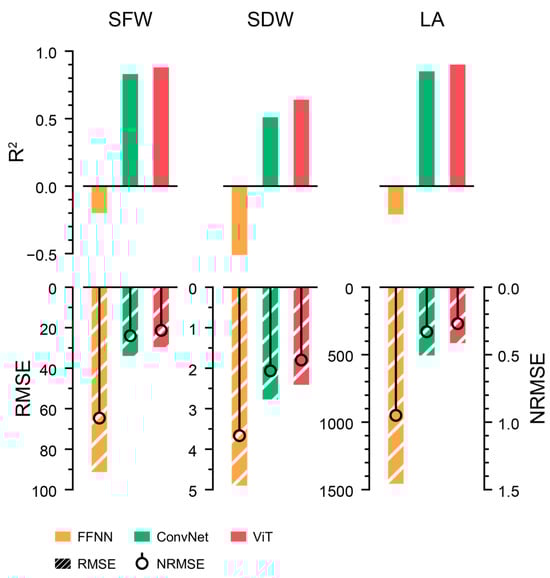 The best structures for ConvNet and ViT were EfficientNet and ViT, respectively (Supplementary Table S1). ViT-s exhibited the best performance, with the highest R2 and the lowest RMSE and NRMSE among the selected models (Figure 3). The input channels, image size, and patch size were also optimized for ViT-s to yield reliable results for training the growth estimators. The best combination was an image size of 100 × 100 and a patch size of 10 × 10 using all the RGB-mask channels. The trained ViT-s with the optimized parameters showed R2 values of 0.89, 0.78, and 0.93 for SFW, SDW, and LA, respectively (Figure 4).