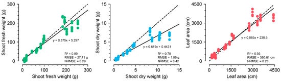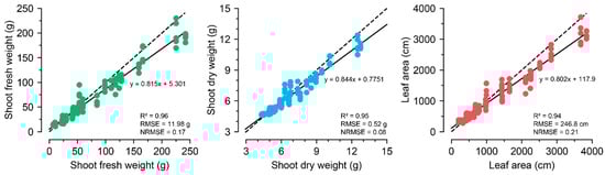 The growth-extraction results from images using ViT-s with the optimized input property. All five training results are represented in the figures. The specified R2, RMSE, and NRMSE represent the best performance among the five training runs. The dashed and solid lines represent y = x and the regression lines, respectively.