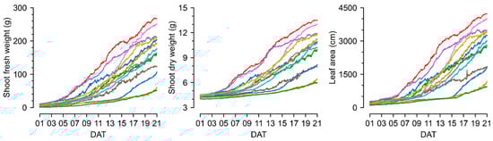 The estimated shoot fresh weight (SFW), shoot dry weight (SDW), and leaf area (LA) from top-view images using the trained image converter, ViT-s according to the days after transplanting (DAT). The same color represents the same cultivation.