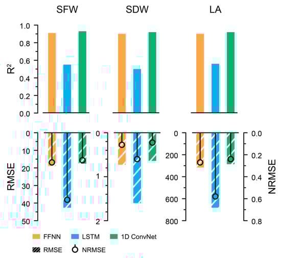 Similar to the image converter, the input property for the 1D ConvNet with U-Net was optimized, and the 2-h interval yielded the best performance. The trained 1D ConvNet with U-Net based on the optimized parameters showed R2 values of 0.96, 0.95, and 0.94 for SFW, SDW, and LA, respectively (Figure 7). The 1D ConvNet with U-Net could predict all growth factors with high accuracy. In contrast to the image converter, the trained FFNN yielded accurate growth factors, although its accuracy was lower than that of the trained 1D ConvNet. In particular, the image converter showed relatively low accuracy for LA, but the growth predictor showed accurate predictions for the estimated LA.