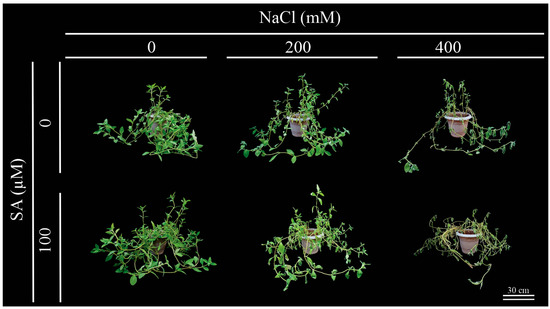 Phenotypic aspects of 66-day-old Dizygostemon riparius plants treated without and with salicylic acid (0 and 100 µM for twenty-one days) and grown under different salinity levels (0, 200, and 400 mM NaCl for six days).