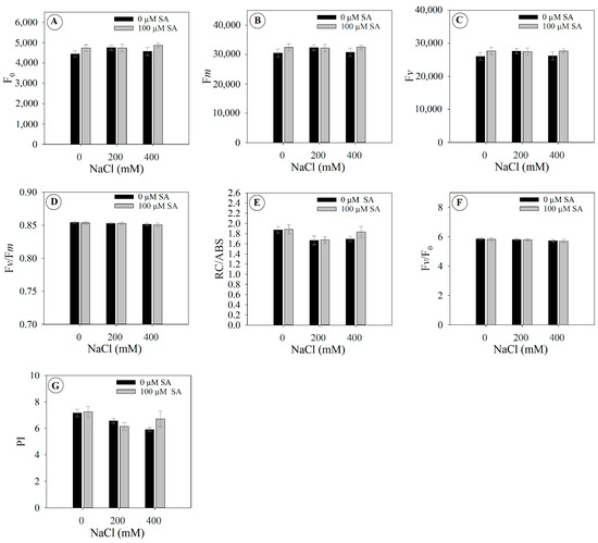 Chlorophyll a fluorescence parameter of 66-day-old Dizygostemon riparius plants treated without and with salicylic acid (0 and 100 µM for twenty-one days) and grown under different salinity levels (0, 200, and 400 mM NaCl for six days). Values represent means ± standard error (n = 5). Means between treatments that are not significantly different are not labeled with letters. (A) Initial fluorescence—F0; (B) maximum fluorescence—Fm; (C) variable fluorescence—Fv; (D) maximum quantum yield of photosystem II—Fv/Fm; (E) energy absorbed per active reaction center—RC/ABS; (F) variable fluorescence per initial fluorescence—Fv/F0, and (G) performance index—PI.