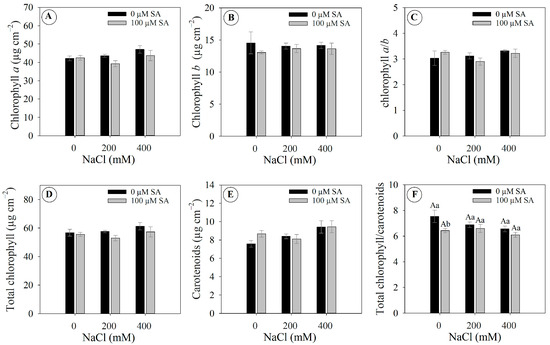 Photosynthetic pigments parameters of 66-day-old Dizygostemon riparius plants treated without and with salicylic acid (0 and 100 µM for twenty-one days) and grown under different salinity levels (0, 200, and 400 mM NaCl for six days). Values represent means ± standard error (n = 5). Capital letters compare salinity levels within each salicylic acid treatment, while lowercase letters compare the control and salicylic acid treatment within each salinity level (Skoot–Knot test; p ≤ 0.05). Means between treatments that are not significantly different are not labeled with letters. (A) Chlorophyll a; (B) Chlorophyll b; (C) Chlorophyll a/b; (D) Total chlorophyll; (E) Carotenoids; and (F) Total chlorophyll/carotenoid.