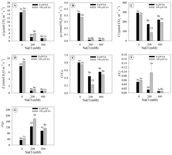 Gas exchange parameters of 66-day-old Dizygostemon riparius plants treated without and with salicylic acid (0 and 100 µM for twenty-one days) and grown under different salinity levels (0, 200, and 400 mM NaCl for six days). Values represent means ± standard error (n = 5). Capital letters compare salinity levels within each salicylic acid treatment, while lowercase letters compare the control and salicylic acid treatment within each salinity level (Skoot–Knot test; p ≤ 0.05). (A) Net carbon assimilation—A; (B) stomatal conductance—gs; (C) internal CO2 concentration—Ci; (D) transpiration rate—E; (E) ambient intercellular CO2 concentration ratio—Ci/Ca; (F) carboxylation efficiency—A/Ci; and (G) intrinsic water-use efficiency—A/gs.