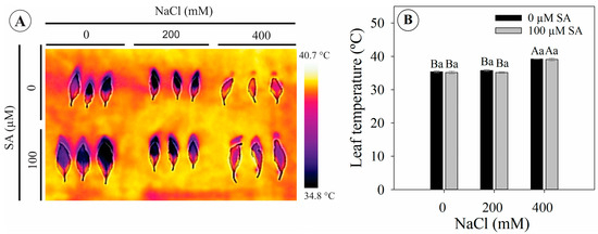 Leaf temperature of 66-day-old Dizygostemon riparius plants treated without and with salicylic acid (0 and 100 µM for twenty-one days) and grown under different salinity levels (0, 200, and 400 mM NaCl for six days). Values represent means ± standard error (n = 5). Capital letters compare salinity levels within each salicylic acid treatment, while lowercase letters compare the control and salicylic acid treatment within each salinity level (Skoot–Knot test; p ≤ 0.05). (A) Thermal imaging and (B) leaf temperature.
