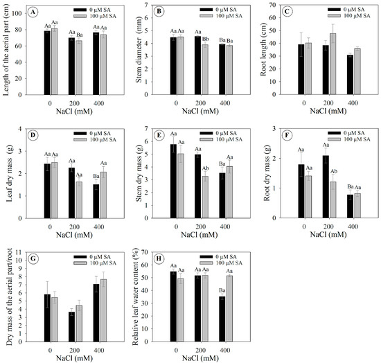 Growth and dry mass parameters of 66-day-old Dizygostemon riparius plants treated without and with salicylic acid (0 and 100 µM for twenty-one days) and grown under different salinity levels (0, 200, and 400 mM NaCl for six days). Values represent means ± standard error (n = 5). Capital letters compare salinity levels within each salicylic acid treatment, while lowercase letters compare the control and salicylic acid treatment within each salinity level (Skoot–Knot test; p ≤ 0.05). Means between treatments that are not significantly different are not labeled with letters. (A) Length of the aerial part (cm); (B) stem diameter (mm); (C) root length (cm); (D) leaf dry mass (g); (E) stem dry mass (g); (F) root dry mass (g); (G) ratio between dry mass of the aerial part and root; and (H) relative rate of leaf water (%).