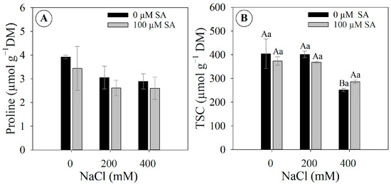 Proline concentration and total soluble carbohydrates (TSC) in leaves of 66-day-old Dizygostemon riparius plants treated without and with salicylic acid (0 and 100 µM for twenty-one days) and grown under different salinity levels (0, 200, and 400 mM NaCl for six days). Values represent means ± standard error (n = 3). Capital letters compare salinity levels within each salicylic acid treatment, while lowercase letters compare the control and salicylic acid treatment within each salinity level (Skoot–Knot test; p ≤ 0.05). Means between treatments that are not significantly different are not labeled with letters. (A) Proline and (B) total soluble carbohydrates—TSC.
