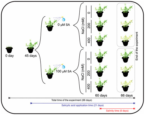 The experiment was conducted in a completely randomized design, in a 2 × 3 factorial scheme [two concentrations of salicylic acid (0 and 100 µM SA) × three salinity levels (0, 200, and 400 mM NaCl)], with five replicates and the experimental unit formed with three plants per pot. The data were tested for normality by the Shapiro–Wilk test, analysis of variance, and the means compared by the Skoot–Knot test (p ≤ 0.05) using the Genes software [51].