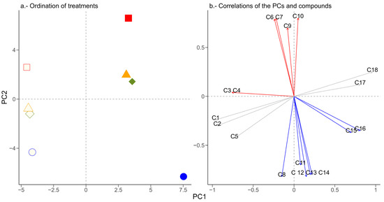 (a) Principal component ordination of the VOCs coming from four treatments of herbivory: <20% (rhombs), >20% (squares), mechanical damage (triangles), and without herbivory (circles) during the years 2016 (empty figures) and 2017 (solid figures). In (b), we show the correlations of the compounds with the PC. C1 = α-Caryophyllene, 2,6,10-Dodecatrien-1-ol-3,7-11-trimethyl-,(E.E)-,1-Hydroxy-1,7-dymethyl-4-isopropyl-2,7-cyclodecadiene,1-Naphthalenol, 1,2,3,4,4a,7,8,8a-octahydro-1,6-dimethyl-4-(1-methylethyl)-,[1R-(1α,4β,4aβ,8aβ)]-, C2 = phytol, C3 = α-Cubebene, C4 = Cadina-1,4-diene, C5 = α-Farnesene, C6 = (Z)-2-Hexenal, C7 = γ-Elemene, C8 = 1-Naphthalenol, decahydro-4a-methyl-8-methylene-2-(1-methylethyl)-,[1R-(1α,2β,4aβ,8aα)]-, C9 = nerolidol, C10 = τ.Cadinol, C11 = Germacrene D, C12 = τ.-Muurolol, C13 = (Z)-3-Hexen-1-ol, C14 = γ-Cadinene, C15 = D25,D18,D7,D19, C16 = α-Muurolene, C17 = D6, and C18 = D3,D2,D1,D8,D4,D12.