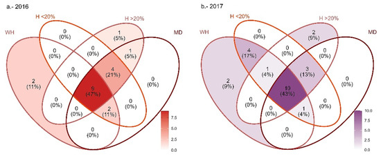 Venn diagrams that represent the distribution of 30 EOs in 4 treatments for (a) 2016 and (b) 2017. WH (without herbivory), H < 20%, H > 20%, and MD (mechanical damage).
