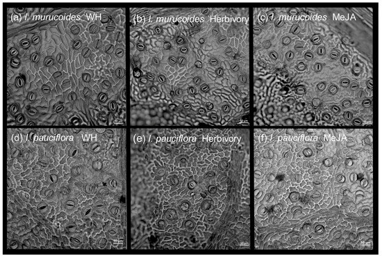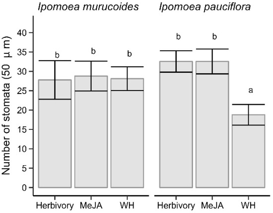 Stomata number in the leaves of two species (I. murucoides and I. pauciflora) that were near to an individual of I. murucoides exposed to herbivory, MeJA, and without herbivory (WH). Dispersion bars are 1SE. Different letters mean significant statistical differences (p < 0.05).