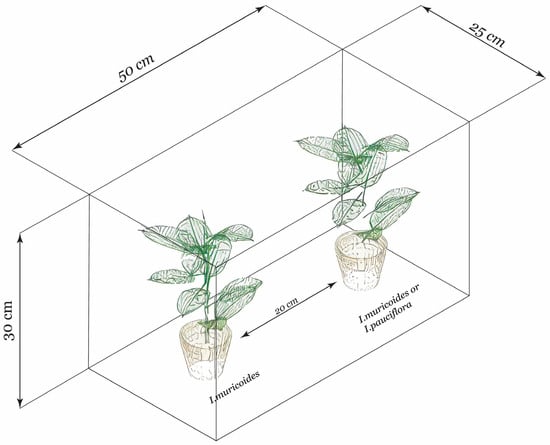 Two Ipomoea plants (separated by a distance of 20 cm) were put inside each of 18 glass boxes (width 25 cm × length 50 cm × height 30 cm) (Figure 5). In each glass box, one I. murucoides plant (putative emitter, from here on designated an emitter) was raffled to one of three treatments: (a) herbivory (H) by O. biannularis, (b) without herbivory (WH), and (c) MeJA; thus, there were six boxes per treatment. Half of these six boxes had one I. murucoides plant as a putative receiver (intraspecific), and the other three boxes had an I. pauciflora plant (interspecific) (Figure 5). The herbivory treatment involved exposing each emitter plant (always I. murucoides) to ten chrysomelid larvae/48 h. The emitter plants were covered with a mesh bag to prevent larval migration between plants. The MeJA treatment was reached by sprinkling MeJA (0.5 µM) six times on the emitter plants, three times at the beginning of the experiment, and three times at the 24 h timepoint. The emitters were sprinkled outside the glass box to prevent MeJA from reaching the neighboring receiver plant. This treatment was a positive control because MeJA participates in the defense mechanism against herbivores [71]. The third treatment was the control, where the emitters were sprinkled with distilled water. After the experimental treatments (MeJA, natural herbivory, and control), we waited until new leaves matured in the receiver plant.