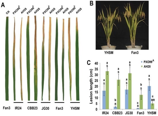 The rice materials used in this study included IR24, CBB23, JG30, YHSM, and Fan3. Rice CBB23 contained Xa23, which is resistant to PXO99A. IR24 and JG30 are rice varieties with high susceptibility to Xoo. YHSM contained Xa4 and was bred by the Rice Research Institute of Guangdong Academy of Agricultural Sciences []. Fan3 contained Xa23, a genetically modified variety based on YHSM, and a new resistance germplasm PR1 from our laboratory. Fan3 had broad-spectrum and high resistance to Xoo. All materials were grown in the greenhouse of the Rice Research Institute of Guangdong Academy of Agricultural Sciences, under conventional water and fertilizer management.