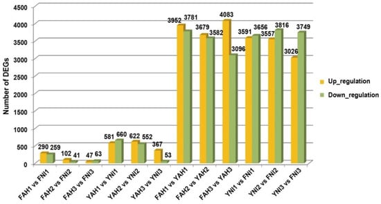 A total of about 209.28 GB of clean data was obtained through RNA-Seq, with an average of 5.81 GB per sample. About 149.10 million raw reads were obtained, and 139.52 million raw reads with a total of 33.66% mapping rate were mapped to the transcriptome. The Q30 values exceeded 94.93%, and the mapping efficiency of clean reads to the reference genome ranged from 92.00% to 96.02%. We performed DEGs analysis based on RNA-seq data under a comprehensive comparison of two paired-end read lengths (150 bp). These results confirmed high sequence quality and data reliability, suitable for subsequent bioinformatics analysis. A total of 14,084 DEGs were identified across different strains and inoculation stages (Table S1). The DEGs for each comparison were as follows: FAH1 vs. FNI1 (up-regulated 290, down-regulated 259), FAH2 vs. FNI2 (up-regulated 102, down-regulated 41), FAH3 vs. FNI3 (up-regulated 47, down-regulated 63), YAH1 vs. YNI1 (up-regulated 581, down-regulated 660), YAH2 vs. YNI2 (up-regulated 622, down-regulated 552), and YAH3 vs. YNI3 (up-regulated 367, down-regulated 53) (Figure 2). Furthermore, the number of DEGs between Fan3 and YHSM inoculated with the same strain was analyzed (Figure 2). More DEGs were detected in YHSM than in Fan3. Significant numbers of DEGs were observed when comparing samples infected with the same strain at the same time points (Figure 2).