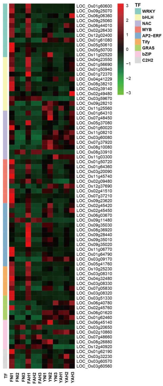 The differential expression of TFs (WRKY, bHLH, NAC, MYB, AP2-ERF, Tify, GRAS, bZIP, and C2H2) in response to the inoculation of two strains. TFs showed increased expression and were more sensitive to immune response in the early stage when the two strains were inoculated with Fan3 compared with YHSM. After the value was homogenized, the color depth indicated the difference between the gene expression and the mean value.