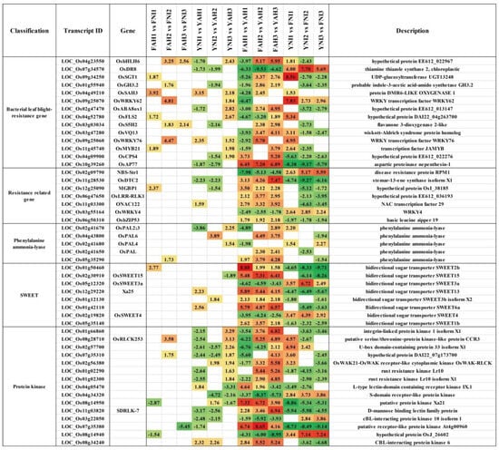 The differential expression of BB gene, resistance-related gene, phenylalanine ammonia-lyase gene, SWEET family gene, and protein kinase among different groups. The DEGs detected in the comparison between different rice inoculated with the same strain increased significantly, and the DEGs detected in the comparison between the same rice inoculated with different strains were significantly decreased. The numbers were the ratios between the comparison groups, with green representing down-regulated, red representing up-regulated, and white representing no significant difference.