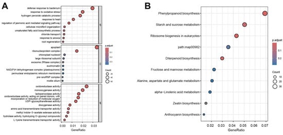 To clarify the functional roles of DEGs in Fan3 and YHSM, GO functional enrichment and KEGG signaling pathway analysis were performed. Six groups (FAH1 vs. FNI1, FAH2 vs. FNI2, FAH3 vs. FNI3, YNI1 vs. YAH1, YNI2 vs. YAH2, and YNI3 vs. YAH3) were analyzed to account for differences in genetic backgrounds between Fan3 and YHSM. GO analysis categorized DEGs into three main categories: cellular component (CC), biological process (BP), and molecular function (MF). A total of 1670 DEGs matched at least one GO term and were further refined into 1028 significantly enriched functional groups, 571 BP, 86 CC, and 371 MF (Figure 6A). In BP, 63 DEGs were mainly enriched in defense response to bacterium (GO:0042742), 43 in response to oxidative stress (GO:0006979), 43 in protein ubiquitination (GO:0016567), and 38 in hydrogen peroxide catabolic process (GO:0042744). Significant enrichment was observed in the CC terms apoplast (GO:0048046) and ribonucleoprotein complex (GO:1990904). In MF, 51 DEGs were significantly enriched in oxidoreductase activity (GO:0016491), 35 in lactoperoxidase activity (GO:0140825), and 29 DEGs in UDP-glycosyltransferase activity (GO:0008194). To determine which MFs are regulated differently to resist pathogen invasion, we performed a GO analysis of the DEGs identified in the six groups (Figure 6A). These results suggest that some disease-resistant proteins or enzymes are involved in transcription, translation, and modification, potentially regulating the biosynthesis and metabolism of secondary metabolites to resist pathogen invasion.