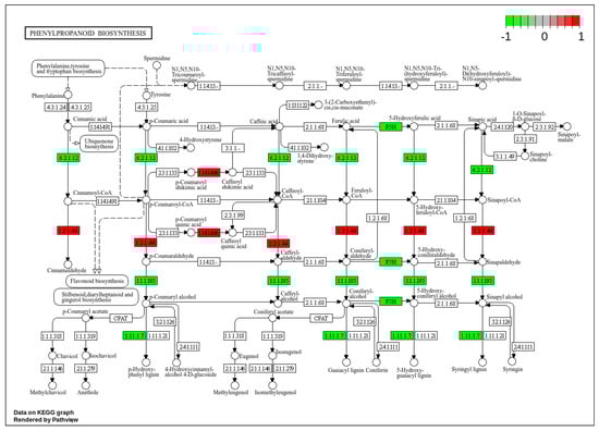 KEGG pathways analysis annotated 1600 genes, matching them to 536 pathways. The main enriched pathways in the six groups included phenylpropanoid biosynthesis, starch and sucrose metabolism, ribosome biogenesis in eukaryotes, diterpenoid biosynthesis, fructose and mannose metabolism, alanine, aspartate, and glutamate metabolism, and anthocyanin biosynthesis (Figure 6B). Significant enrichment was found in phenylpropanoid biosynthesis, diterpenoid biosynthesis, ribosome biogenesis in eukaryotes, and starch and sucrose metabolism pathways. The phenylpropanoid biosynthesis pathway was used to reveal the most relevant biological functions of DEGs in YNI1 vs. YAH1 (Figure 7). Significantly elevated DEGs included 5-O-(4-coumaroyl)-D-quinate 3′-Monooxygenase (EC:1.14.14.96) and cinnamoyl-CoA reductase (EC:1.2.1.44), while DEGs from 4-coumarate-CoA ligase (EC:6.2.1.12), ferulate 5-hydroxylase (EC:1.14.-.-), cinnamyl-alcohol dehydrogenase (EC:1.1.1.195), and peroxidase (EC:1.11.1.7) were significantly down-regulated. These results indicate that pathways involved in Xoo in Fan3 and YHSM were mainly concentrated in phenylpropanoid biosynthesis, ribosome biogenesis in eukaryotes, and various metabolite synthesis pathways.