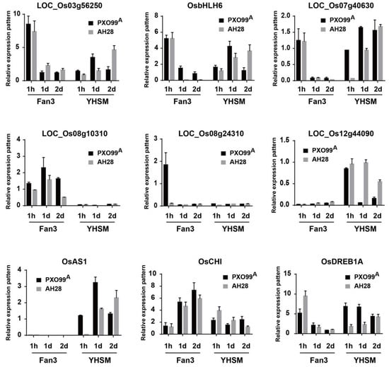 The responses of DEGs to AH28 and PXO99A at different times were verified by qRT-PCR. DEGs were randomly selected for qRT-PCR. The values were mean ± SD of the three biological replicates. 1 h, 1 d, and 2 d refer to 1 h after inoculation (hpi), 1 d after inoculation (dpi), and 2 dpi, respectively.