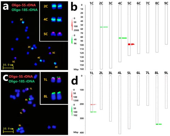 Bernardes et al. [4] performed FISH analysis utilizing rDNA probes in Chicory, identifying 45S rDNA loci on chromosomes 1 and 3 and 5S rDNA loci on chromosome 8. Wang et al. [19] indicated that Lettuce possesses two nucleolus organizer regions (NORs) located on chromosomes 1 and 8. According to the prediction of tandem repeats in the Chicory genome, chromosomes 2C and 4C exhibited 18S rDNA loci close to centromeric regions, with 110 and 209 copies, respectively. Meanwhile, chromosome 5C showed abundant 5S rDNA sites around 96–99 Mb locations (Table S2, Figure 1b). ND-FISH with probes Oligo-18S rDNA + Oligo-5S rDNA was used to identify mitotic metaphase chromosomes in Chicory. Two pairs of chromosomes displayed distinct green signals in the centromeric regions. One pair, characterized by shorter chromosomes and a higher copy number, was designated chromosome 4C. The other pair, with longer chromosomes and a lower copy number, retained the name 2C. The probe Oligo-5S rDNA displayed strong red signals on a pair of chromosomes characterized as 5C chromosomes (Figure 1a). Likewise, the localization of rDNA sites in Lettuce indicated that chromosomes 1L and 8L carried 18S rDNA sites at the terminal region, and two additional 5S rDNA sites were located in the subterminal region of 1L near 18S rDNA sites (Table S1, Figure 1d). As shown in Figure 1c, the short arm of chromosome 1L contained strong Oligo-18S rDNA and Oligo-5S rDNA signals, while chromosome 8L contained only Oligo-18S rDNA signals. Furthermore, 5S rDNA sites were located on the short arm of 5C, indicating a reversed direction of the physical assembly location of Chicory. The predicted physical locations of tandem repeat using the B2DSC web server corresponded closely with the cytological positions, indicating the accuracy and reliability of the sequence assembly for Chicory and Lettuce in the rDNA sites.