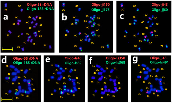 - Tang, S.Y.; Tang, Z.X.; Qiu, L.; Yang, Z.J.; Li, G.R. Developing new oligo probes to distinguish specific chromosomal segments and the A, B, D genomes of wheat (Triticum aestivum L.) using ND-FISH. Front. Plant Sci. 2018, 9, 1104. [Google Scholar] [CrossRef]